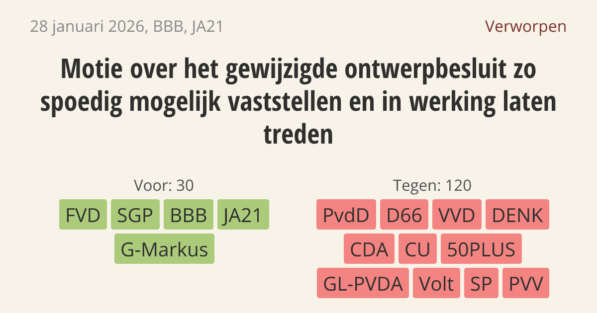 Motie van de leden Van der Plas en Boomsma over het gewijzigde ontwerpbesluit zo spoedig mogelijk vaststellen en in werking laten treden