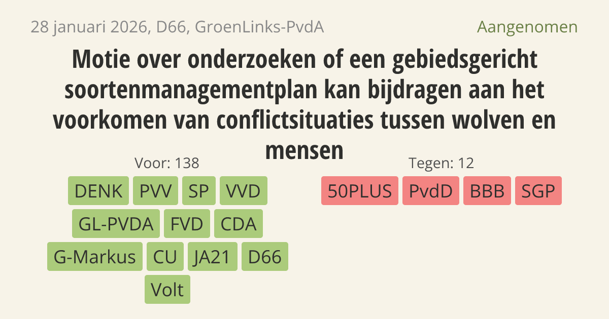 Het kabinet moet onderzoeken of er een speciaal plan kan komen om sneller in te grijpen bij wolven in de buurt van mensen. Wolven zorgen nu voor angst en onduidelijkheid bij inwoners en lokale bestuurders. Met een gebiedsgericht plan kunnen gemeentes en beheerders direct en volgens de wet handelen zonder telkens nieuwe vergunningen aan te vragen.