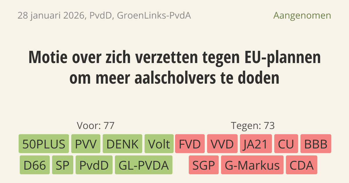 De regering moet zich verzetten tegen Europese plannen om aalscholvers af te schieten. De Europese Commissie wil deze vogels doden omdat ze vissen eten. In Nederland eten aalscholvers echter vooral vissoorten waar mensen niet op vissen. Volgens de staatssecretaris is er geen bewijs dat de vogels een gevaar vormen voor de visstand, waardoor het doden van deze dieren niet nodig is.