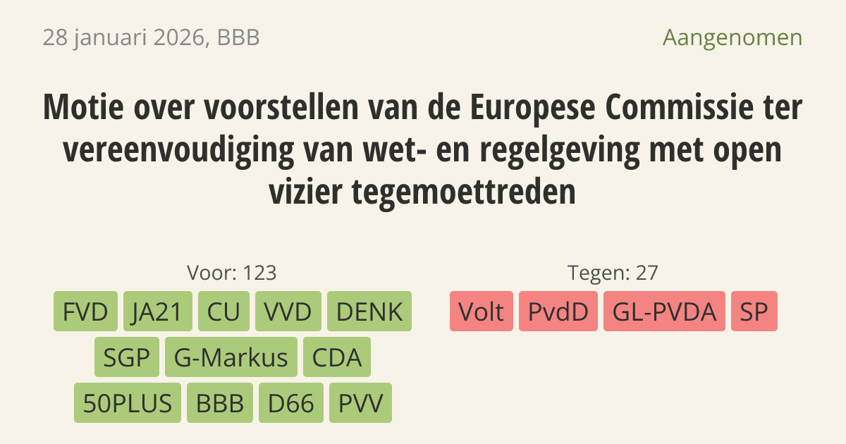 De regering moet plannen van de Europese Commissie voor minder strenge regels positief bekijken. Nu zorgen Europese regels te vaak voor problemen voor ondernemers en burgers, bijvoorbeeld bij een verbouwing. Bij nieuwe voorstellen moet de regering extra letten op de gevolgen voor de portemonnee en het gemak van Nederlanders.