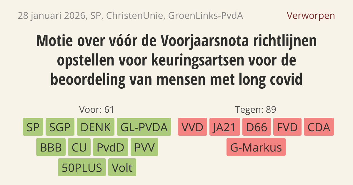 De regering en het UWV moeten vóór de Voorjaarsnota nieuwe richtlijnen maken voor keuringsartsen. Mensen met long covid krijgen nu vaak een verkeerde beoordeling van hun arbeidsongeschiktheid. Met de nieuwe regels moeten zij een eerlijke uitslag krijgen over hun mogelijkheid om te werken.