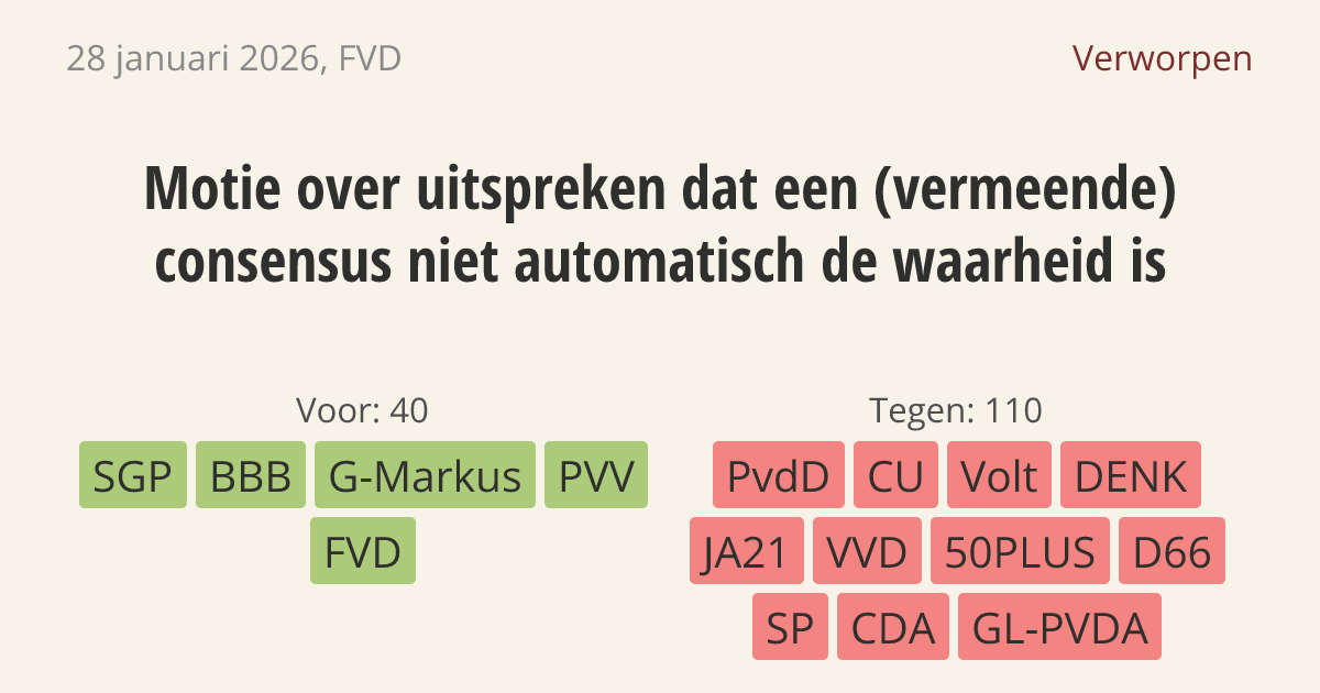 Motie van het lid Van Houwelingen over uitspreken dat een (vermeende) consensus niet automatisch de waarheid is