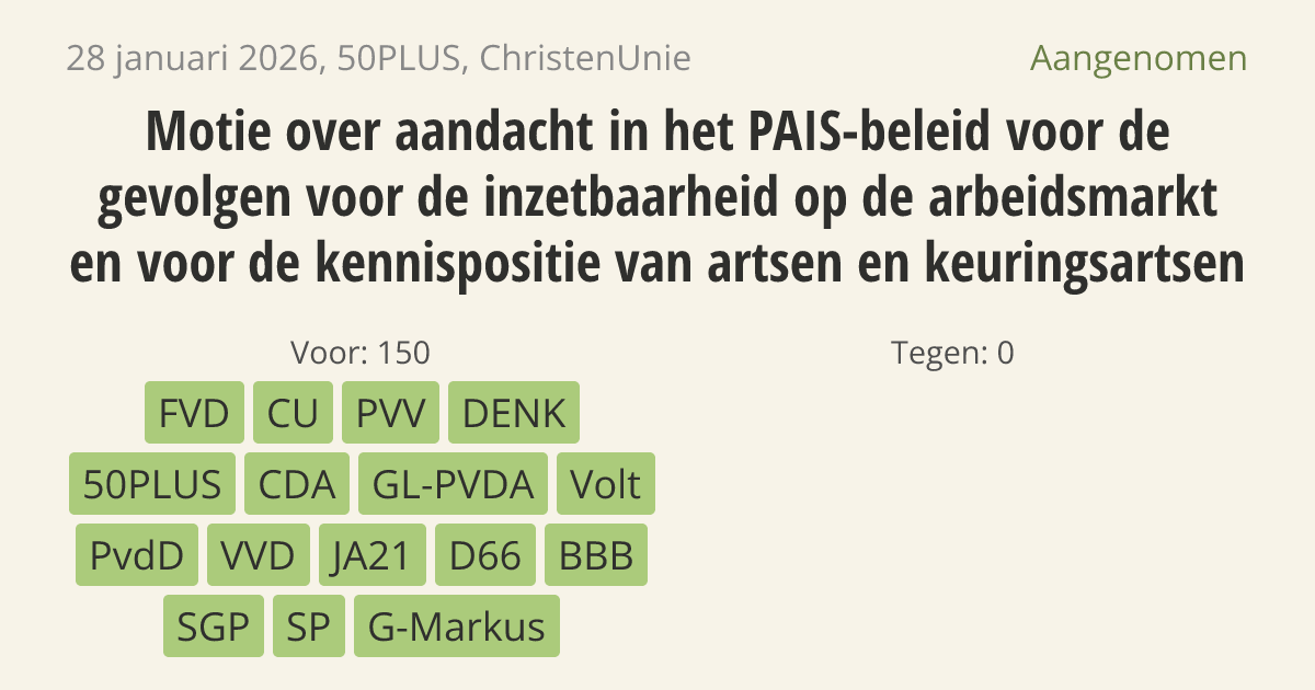 De regering moet ervoor zorgen dat keuringsartsen van het UWV meer kennis krijgen over PAIS (langdurige klachten na een infectie, zoals long covid). Ook moet er meer aandacht komen voor de gevolgen van deze ziekte op het werk en inkomen. Nu ontbreekt het vaak aan erkenning, waardoor tienduizenden zieke mensen hun baan of inkomen verliezen.