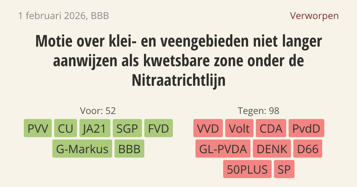 Motie van het lid Van der Plas over klei- en veengebieden niet langer aanwijzen als kwetsbare zone onder de Nitraatrichtlijn