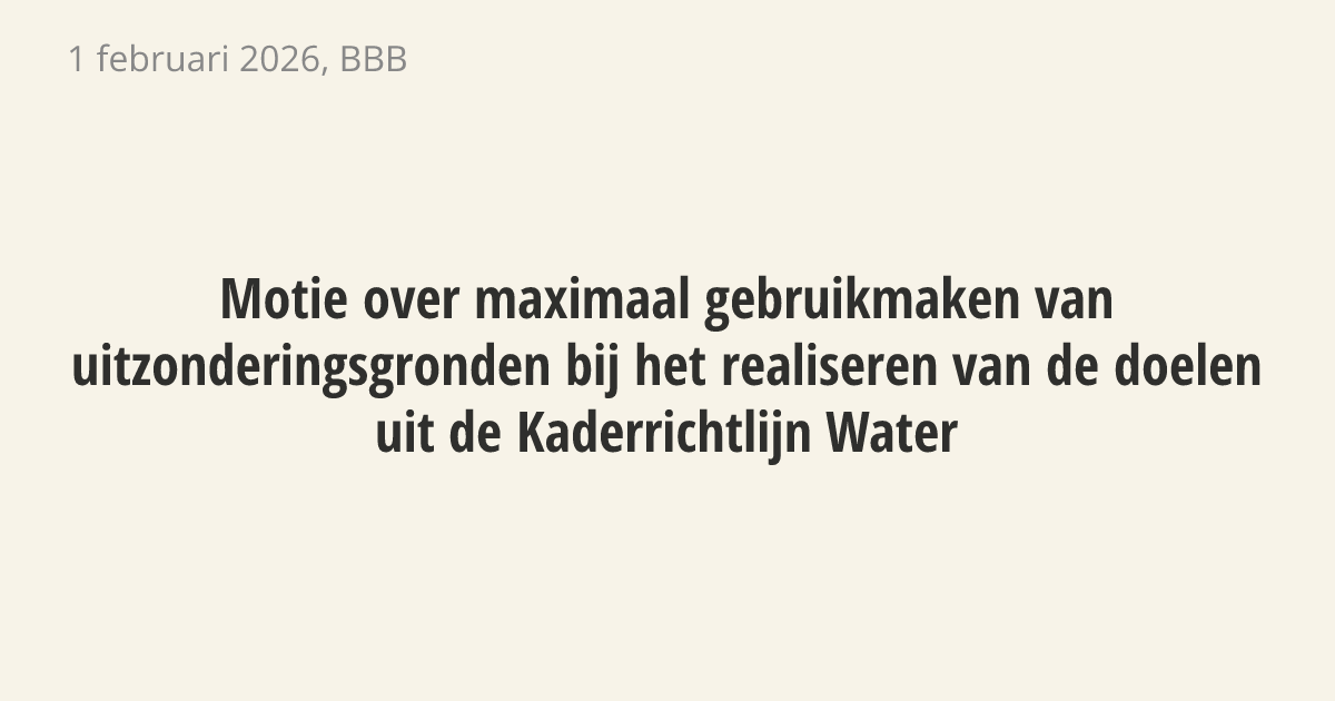 De regering moet alle uitzonderingen in de Europese Kaderrichtlijn Water gebruiken. Door historische vervuiling en water uit het buitenland zijn de doelen voor Nederland lastig te halen. Zonder deze uitzonderingen moeten de landbouw en industrie te zware en dure maatregelen nemen. De regering moet daarom juridisch onderbouwen waarom Nederland meer tijd of ruimte nodig heeft voor schoon water.