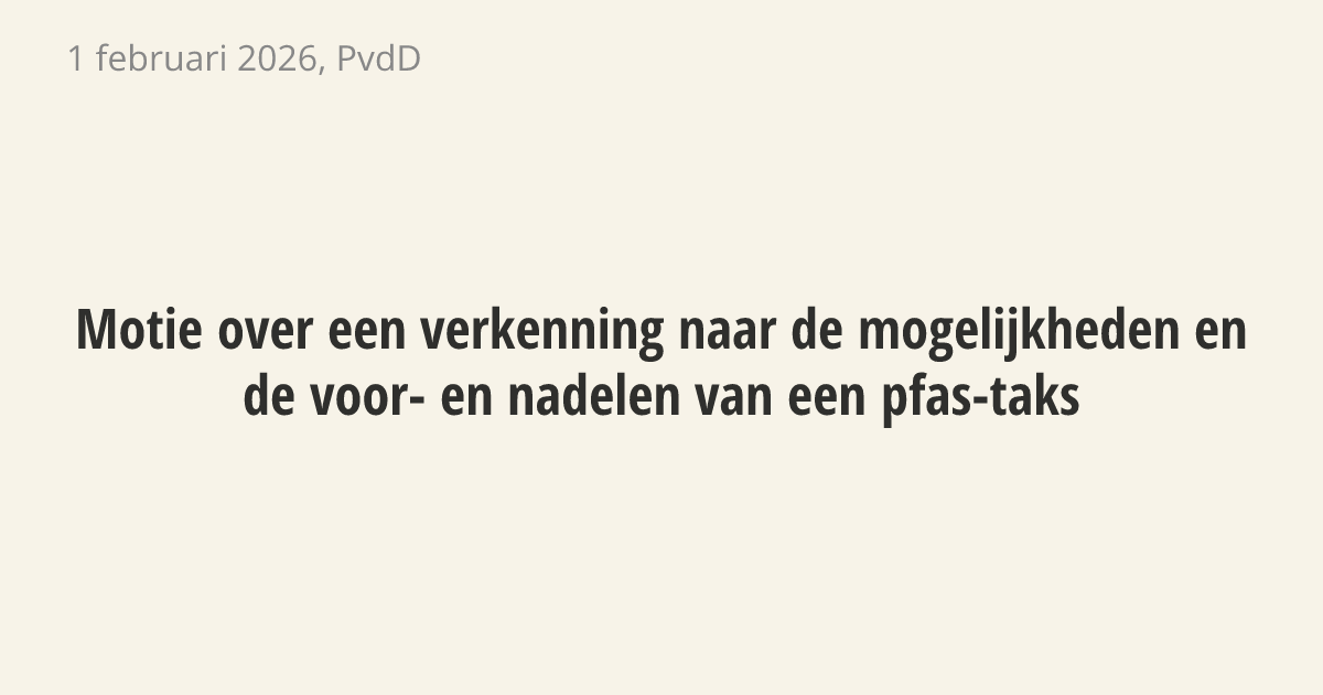 De regering moet onderzoeken of er een PFAS-taks kan komen. Deze belasting op schadelijke stoffen moet ervoor zorgen dat vervuilende bedrijven zelf betalen voor de schade. Nu betaalt de burger vaak nog voor het opruimen van vervuiling en het schoonmaken van water. Een PFAS-taks stimuleert bedrijven bovendien om te werken met schonere alternatieven.