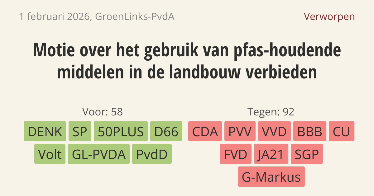 De regering moet het gebruik van bestrijdingsmiddelen met PFAS in de landbouw zo snel mogelijk verbieden. PFAS zijn giftige stoffen die nooit meer uit de natuur verdwijnen en schadelijk zijn voor de gezondheid. Er worden nu grote hoeveelheden over het land gespoten, terwijl er goede alternatieven beschikbaar zijn.