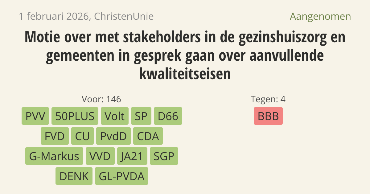 De regering moet met gemeenten en de sector afspraken maken over extra kwaliteitseisen voor gezinshuizen. Nu mogen mensen al een gezinshuis starten met alleen een beroepsregistratie. Er is pas controle op de locatie als het huis al open is. Door extra eisen te stellen, zoals een fysiek bezoek vooraf, wordt de kwaliteit voor kinderen in de jeugdzorg beter gewaarborgd.