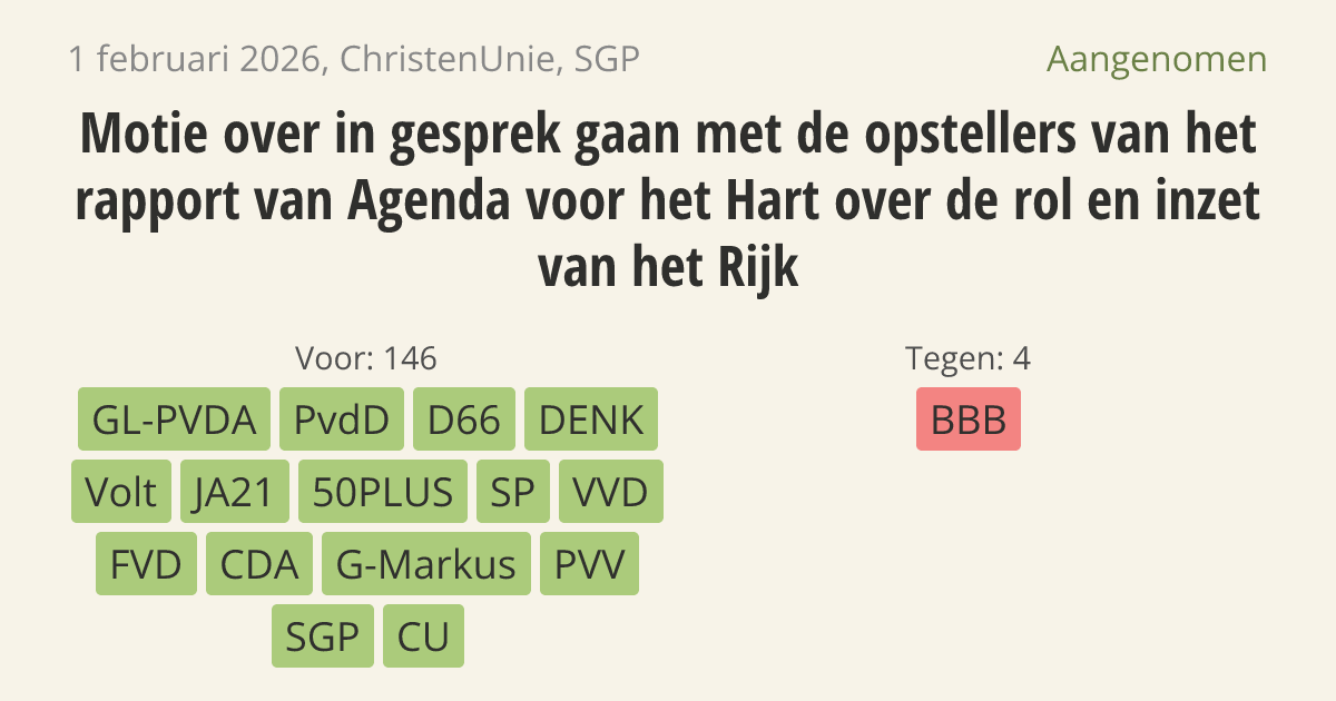 De regering moet in gesprek gaan met de makers van het rapport Agenda voor het Hart. Dit rapport bevat plannen voor de overheid en zorg om gezinnen en relaties sterker te maken. Hoewel de meeste ouders hun kinderen zelf goed kunnen opvoeden, is er in moeilijke situaties extra steun nodig. De regering moet bekijken welke adviezen uit het rapport ze kan uitvoeren.