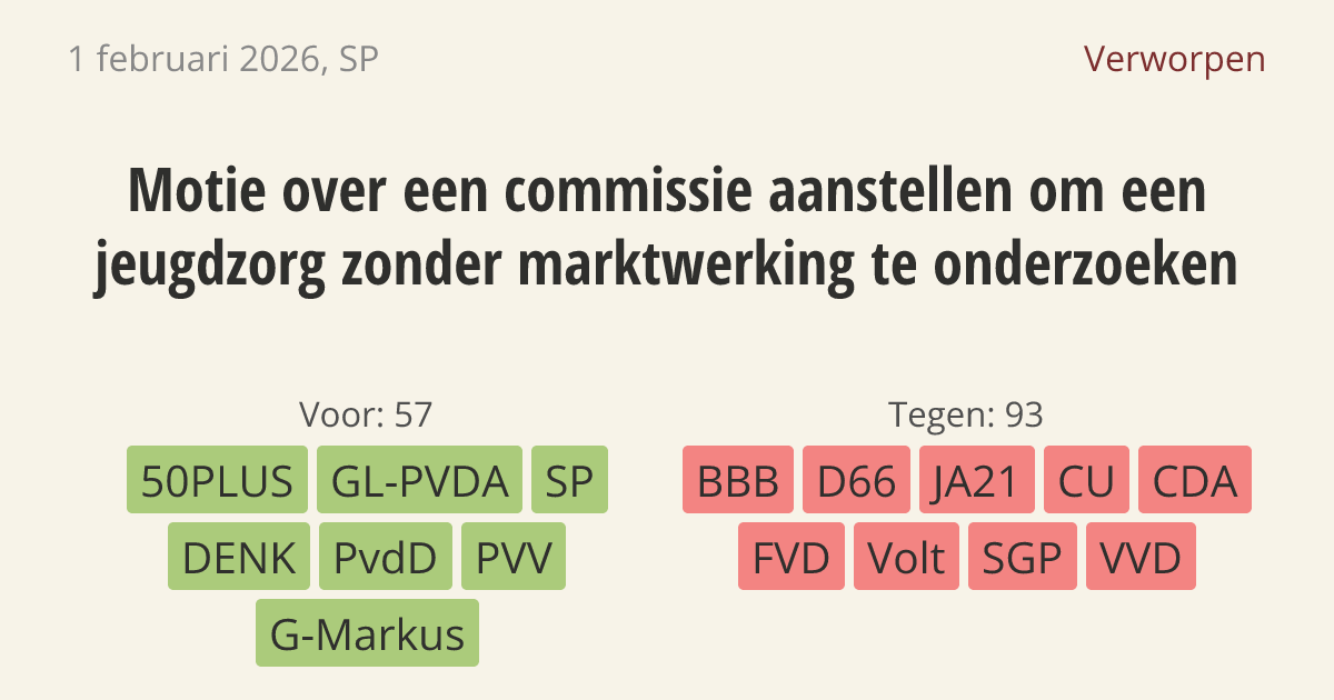 De regering moet een commissie oprichten die onderzoekt hoe de jeugdzorg kan werken zonder marktwerking en aanbestedingen. De huidige marktwerking zorgt voor hoge kosten en winsten, terwijl gezinnen niet de hulp krijgen die zij nodig hebben.