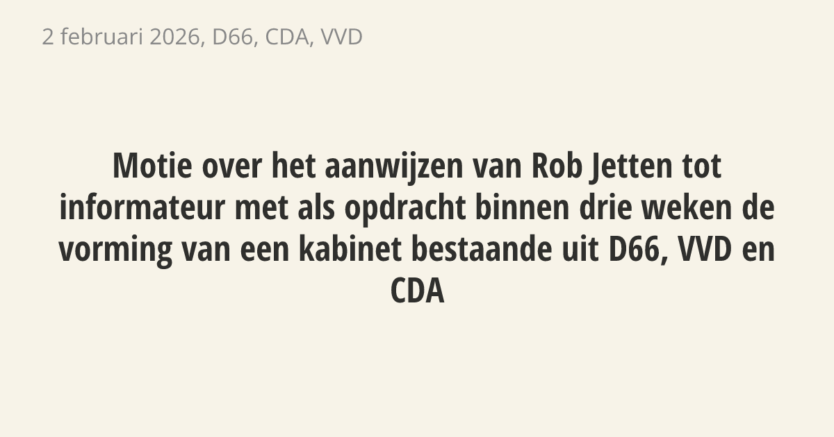 Motie van het lid Jetten c.s. over het aanwijzen van Rob Jetten tot informateur met als opdracht binnen drie weken de vorming van een kabinet bestaande uit D66, VVD en CDA