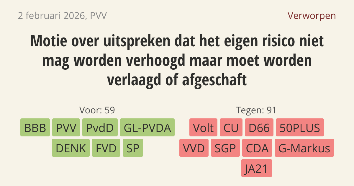 De kamer, spreekt uit dat het eigen risico niet mag worden verhoogd maar moet worden verlaagd of afgeschaft.