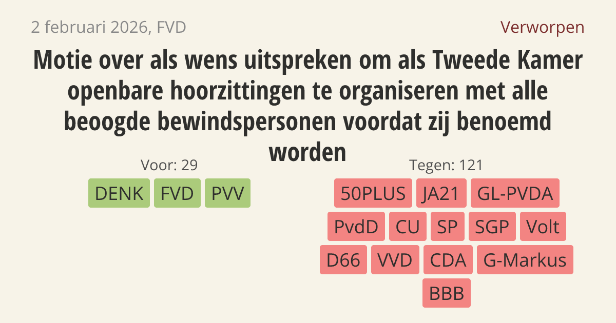 Motie van het lid De Vos over als wens uitspreken om als Tweede Kamer openbare hoorzittingen te organiseren met alle beoogde bewindspersonen voordat zij benoemd worden