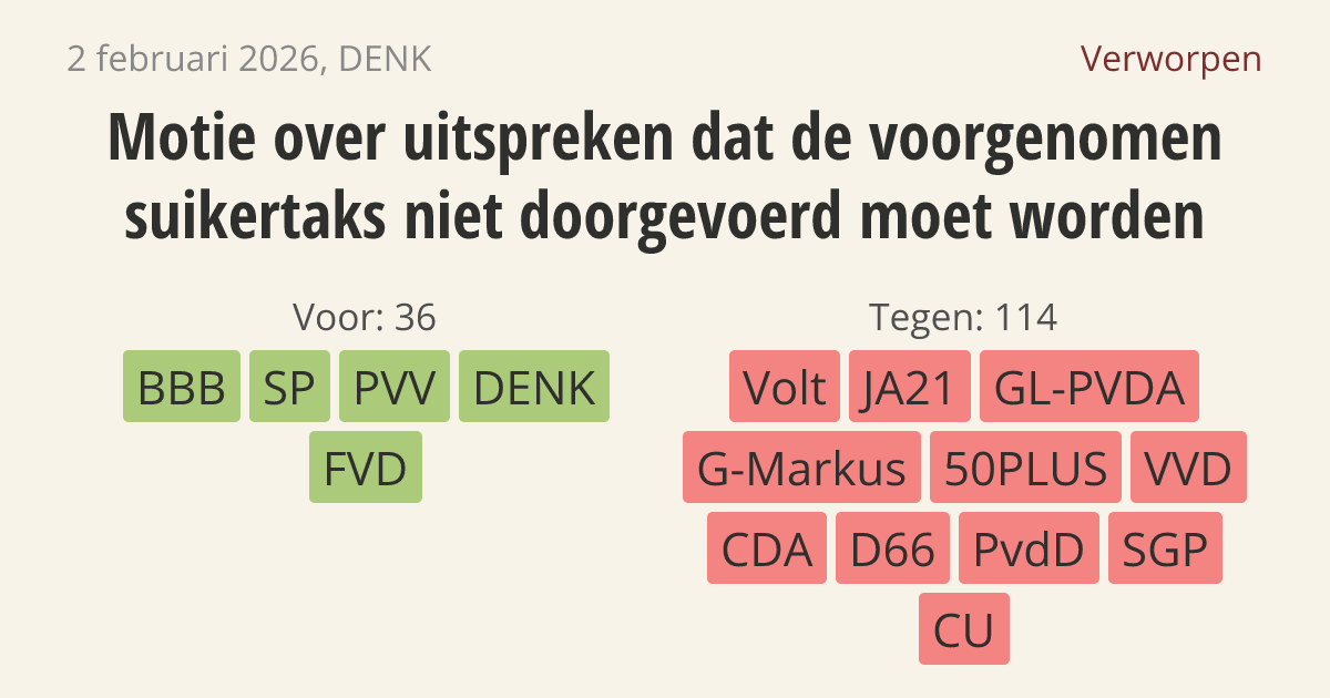 De kamer, spreekt uit dat de voorgenomen suikertaks niet doorgevoerd moet worden.