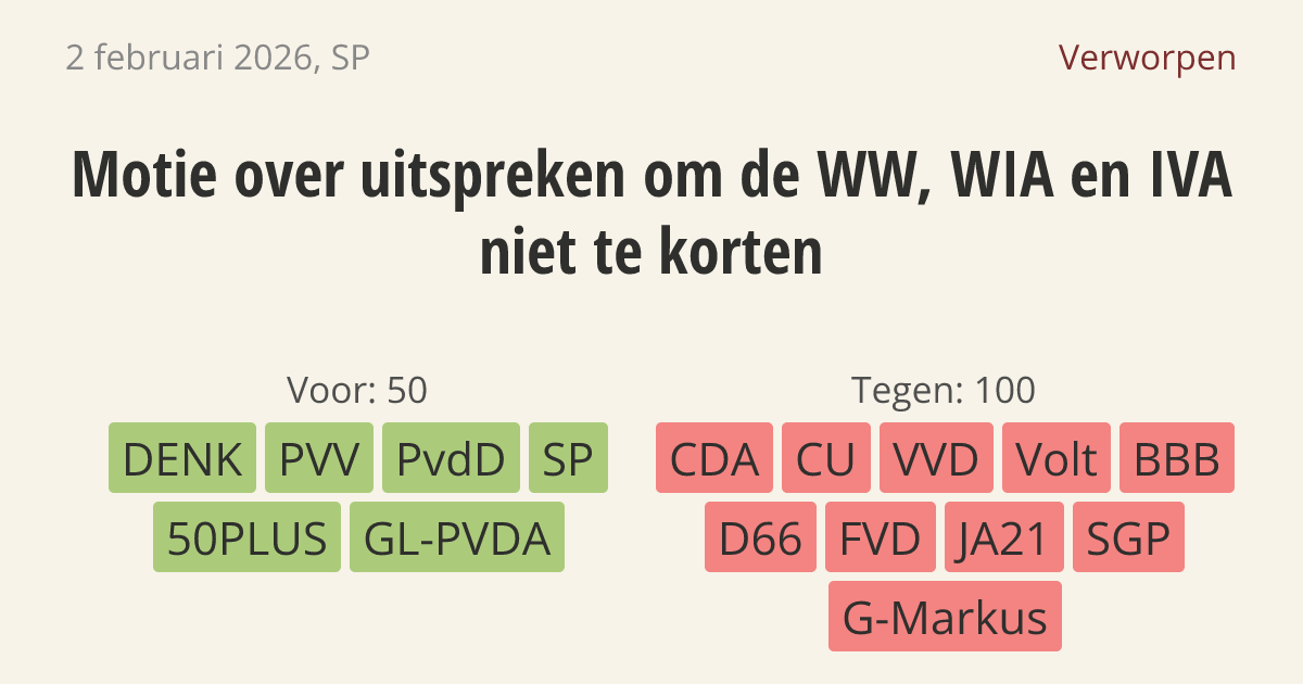De regering mag de WW, WIA en IVA niet verlagen. Het verliezen van een baan of langdurig ziek zijn heeft al grote gevolgen. Mensen die dit overkomt hebben financiële zekerheid nodig. Bezuinigingen op deze werknemersverzekeringen zorgen voor onzekerheid en grote problemen bij de getroffenen.