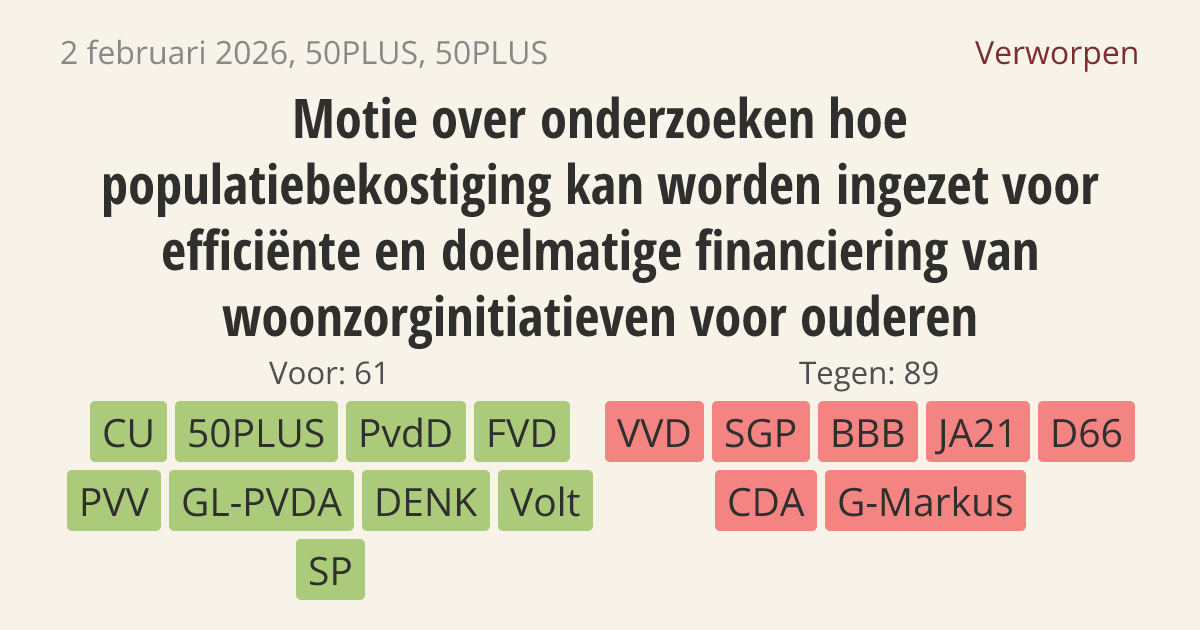 De formateur moet onderzoeken hoe woonzorginitiatieven voor ouderen betaald kunnen worden via populatiebekostiging. Bij deze vorm van financiering krijgt een wijk of buurt een vast bedrag voor de zorg van alle inwoners. Dit helpt om het geld voor kwetsbare ouderen efficiënter te gebruiken, omdat lokale projecten nu vaak vastlopen door een tekort aan structureel geld.