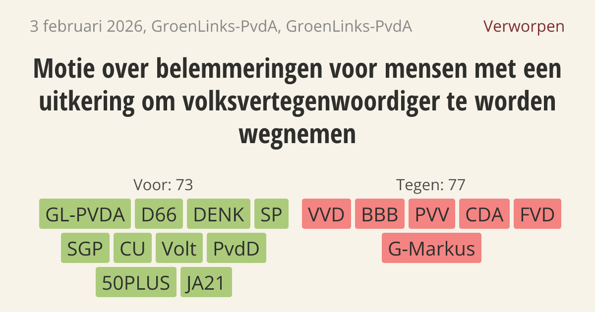 Het kabinet moet samen met gemeenten, provincies en waterschappen de hindernissen wegnemen voor mensen met een uitkering die de politiek in willen. Nu ervaren zij vaak nog te veel geldzorgen en papierwerk. Het hebben van een uitkering mag geen reden zijn om geen volksvertegenwoordiger te kunnen worden.