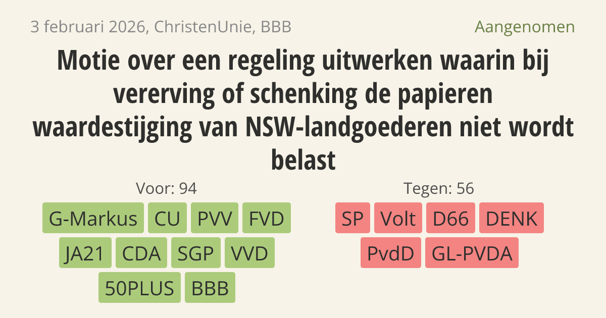 Motie van de leden Grinwis en Vermeer over een regeling uitwerken waarin bij vererving of schenking de papieren waardestijging van NSW-landgoederen niet wordt belast