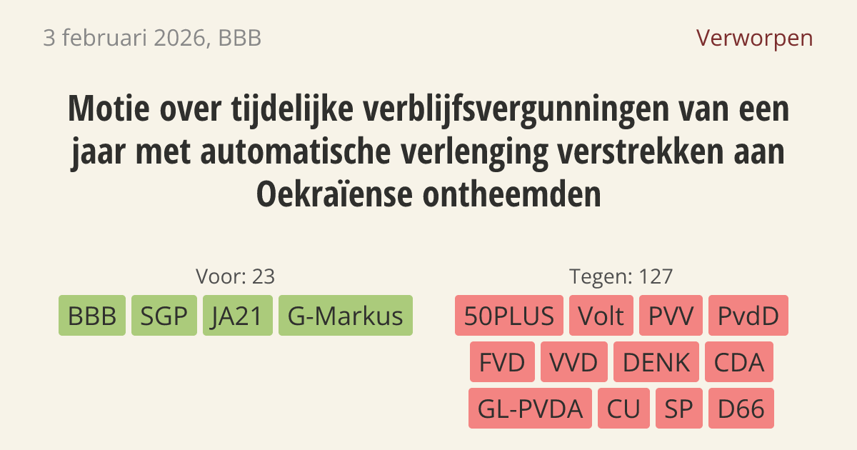 De regering moet Oekraïense vluchtelingen een verblijfsvergunning voor één jaar geven in plaats van drie jaar. Deze vergunning wordt wel elk jaar automatisch verlengd zolang de oorlog duurt. Een kortere vergunning zorgt ervoor dat Oekraïners na de oorlog sneller teruggaan naar hun eigen land. Zo kunnen zij helpen bij de wederopbouw van Oekraïne.