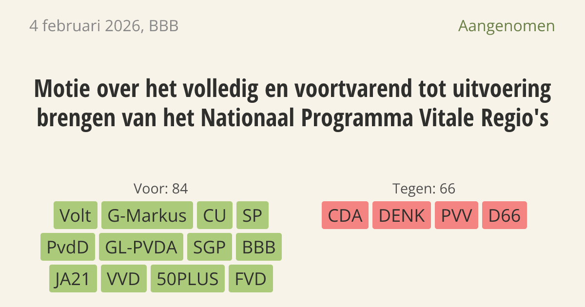 De regering moet genoeg geld vrijmaken voor het Nationaal Programma Vitale Regio's. Sommige regio's in Nederland worden al lange tijd achtergesteld. Dit nieuwe programma kan deze gebieden alleen verbeteren als er voldoende budget is om alle plannen snel en volledig uit te voeren.