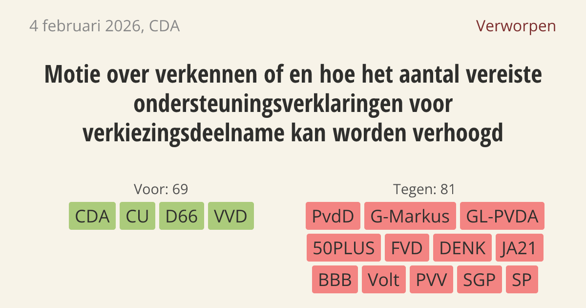 De regering moet onderzoeken of nieuwe politieke partijen meer handtekeningen van kiezers moeten verzamelen om mee te mogen doen aan de verkiezingen. Nu is de drempel erg laag. Dit zorgt voor te veel verschillende kleine partijen in de Tweede Kamer. Een hogere drempel zorgt ervoor dat alleen partijen met genoeg steun vanuit de samenleving meedoen.
