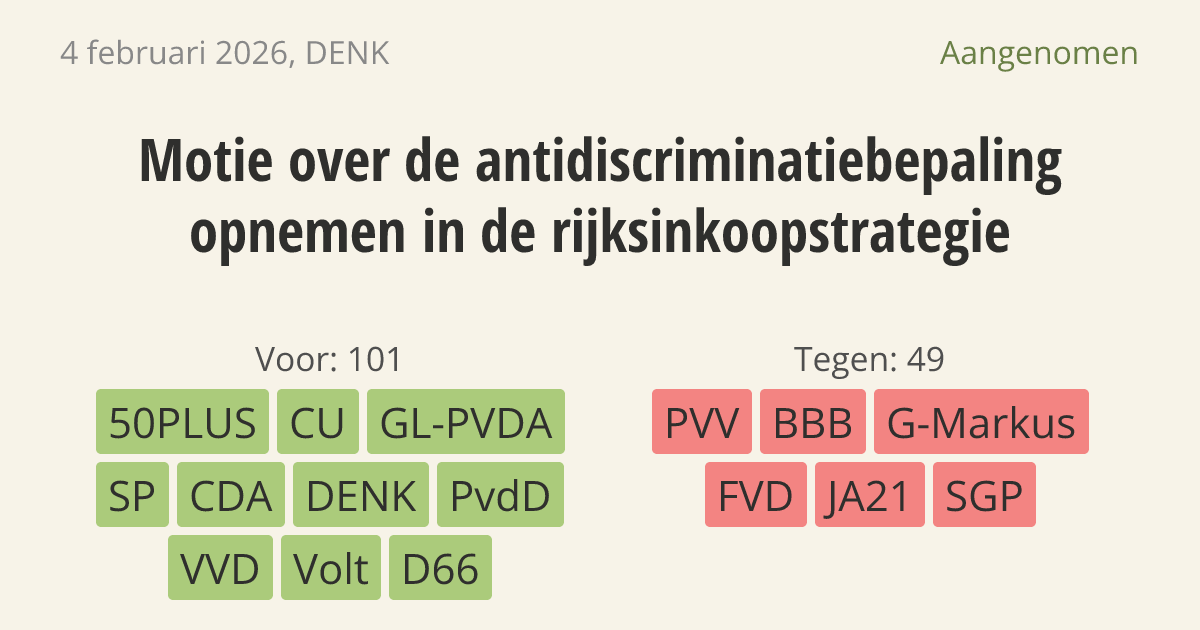 De regering moet de regels voor inkopen door de overheid aanpassen. Bedrijven die door een rechter zijn veroordeeld voor discriminatie, mogen geen opdrachten meer krijgen. De rijksoverheid hoort niet samen te werken met dit soort bedrijven. De nieuwe regels moeten voortaan overal binnen de landelijke overheid gelden.