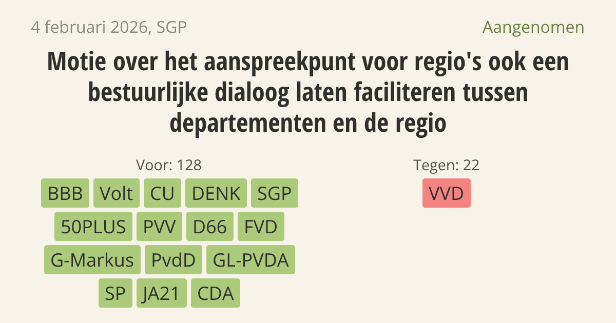 De regering moet zorgen dat alle regio's een vast aanspreekpunt krijgen voor overleg met ministeries. Hiermee wordt voorkomen dat er een kansenkloof ontstaat tussen gebieden die wel of niet meedoen aan landelijke programma's. Zo kunnen alle regio's werken aan een langetermijnplan voor hun eigen omgeving.