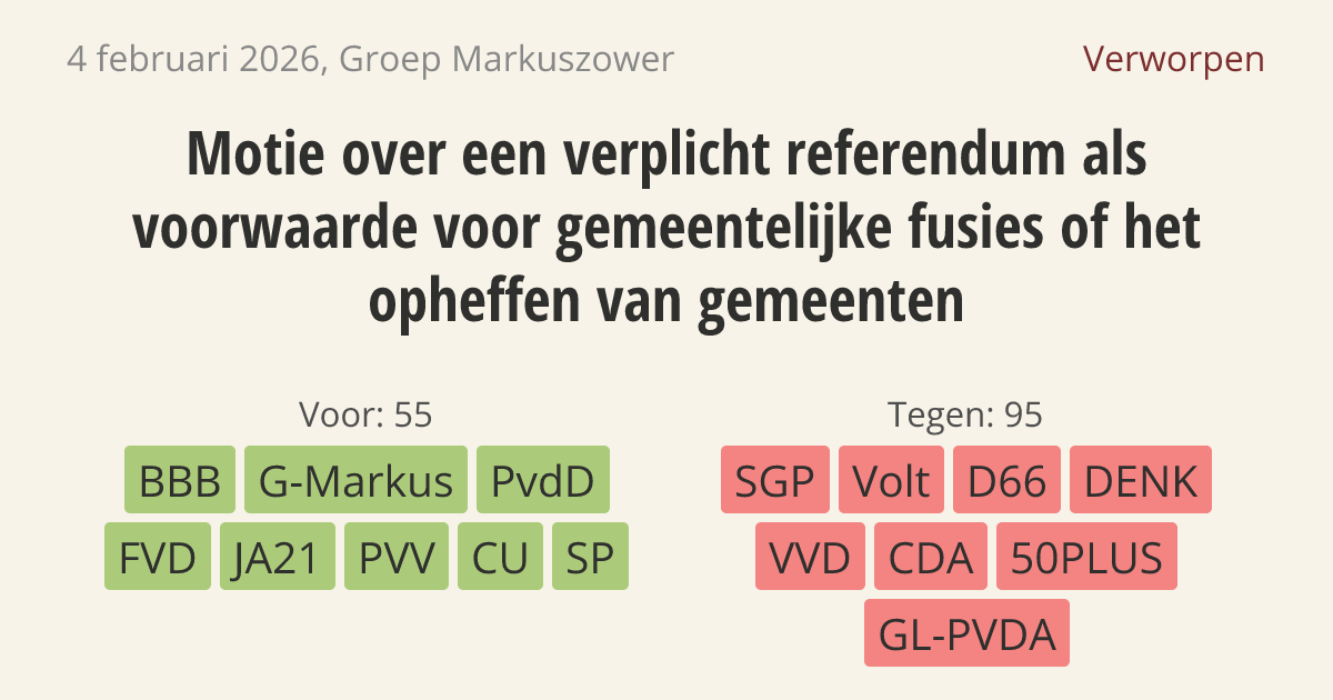 De regering moet een wet maken die een referendum verplicht bij het fuseren of opheffen van gemeenten. Een fusie heeft grote gevolgen voor inwoners en de lokale democratie. Daarom is het belangrijk dat de lokale bevolking vooraf zelf kan beslissen of er genoeg steun voor is. Alleen inspraak is niet voldoende voor zulke ingrijpende besluiten.