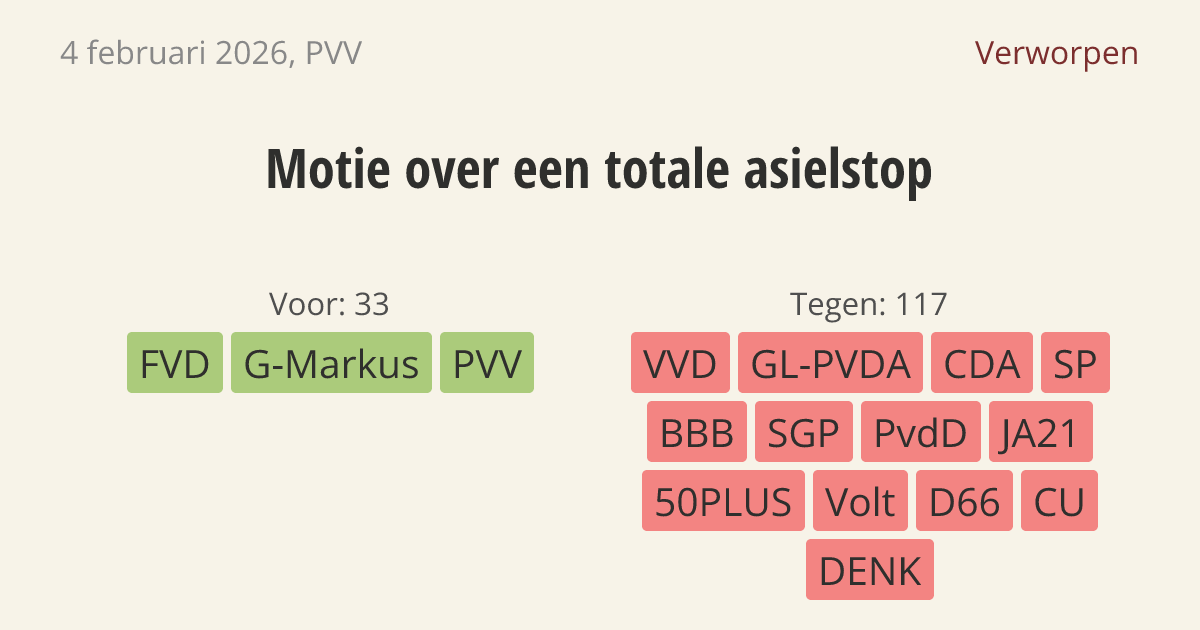 verzoekt de regering per direct een totale asielstop in te voeren alsook een
