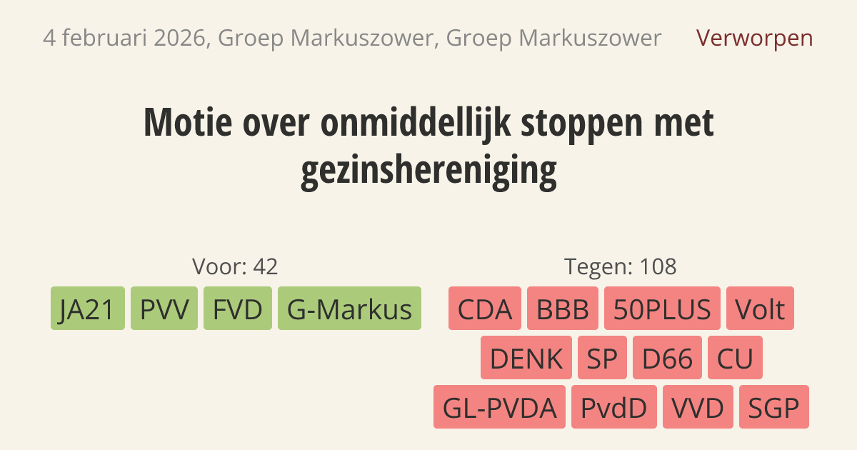 De regering moet direct stoppen met het samenvoegen van gezinnen van asielzoekers. Nederland kan de huidige instroom niet aan door grote tekorten aan huizen en personeel in het onderwijs en de zorg. Een tijdelijke stop is volgens internationaal recht mogelijk, zoals blijkt uit een vergelijkbaar besluit van Oostenrijk.