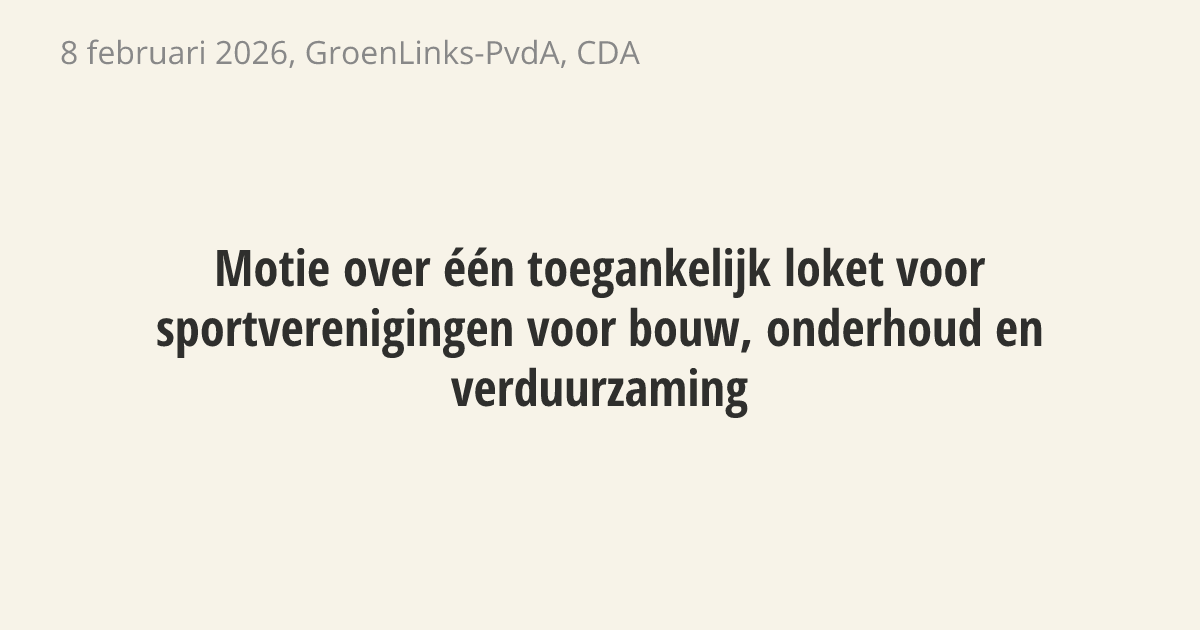 De regering moet zorgen voor één centraal loket waar sportverenigingen terechtkunnen voor geld voor bouw, onderhoud en verduurzaming. Nu moeten clubs vaak bij verschillende regelingen aankloppen. Dit zorgt voor te veel papierwerk en gedoe. Eén loket maakt het voor verenigingen makkelijker om hun gebouwen te verbeteren.