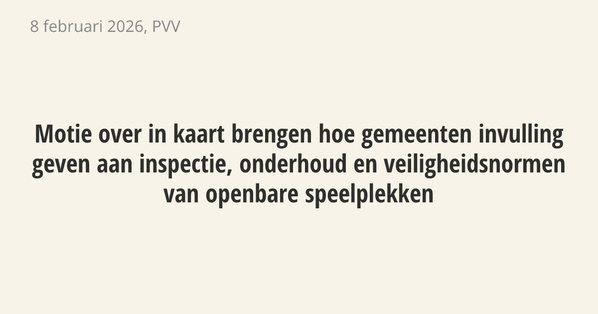 De regering moet laten onderzoeken of openbare speeltuinen overal in Nederland wel veilig genoeg zijn. Nu verschillen het onderhoud en de controles per gemeente. Door de situatie overal in kaart te brengen, kan de overheid besluiten of er landelijke regels nodig zijn. Ouders moeten er namelijk op kunnen vertrouwen dat hun kinderen overal veilig buiten kunnen spelen.