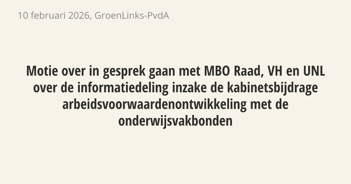 De regering moet met de onderwijsraad en universiteiten in gesprek gaan over het delen van financiële informatie met vakbonden. Het gaat om de kabinetsbijdrage voor nieuwe cao-afspraken in het mbo en hoger onderwijs. Het is belangrijk dat alle sociale partners, zoals vakbonden, direct weten hoeveel geld er beschikbaar is voor de arbeidsvoorwaarden.