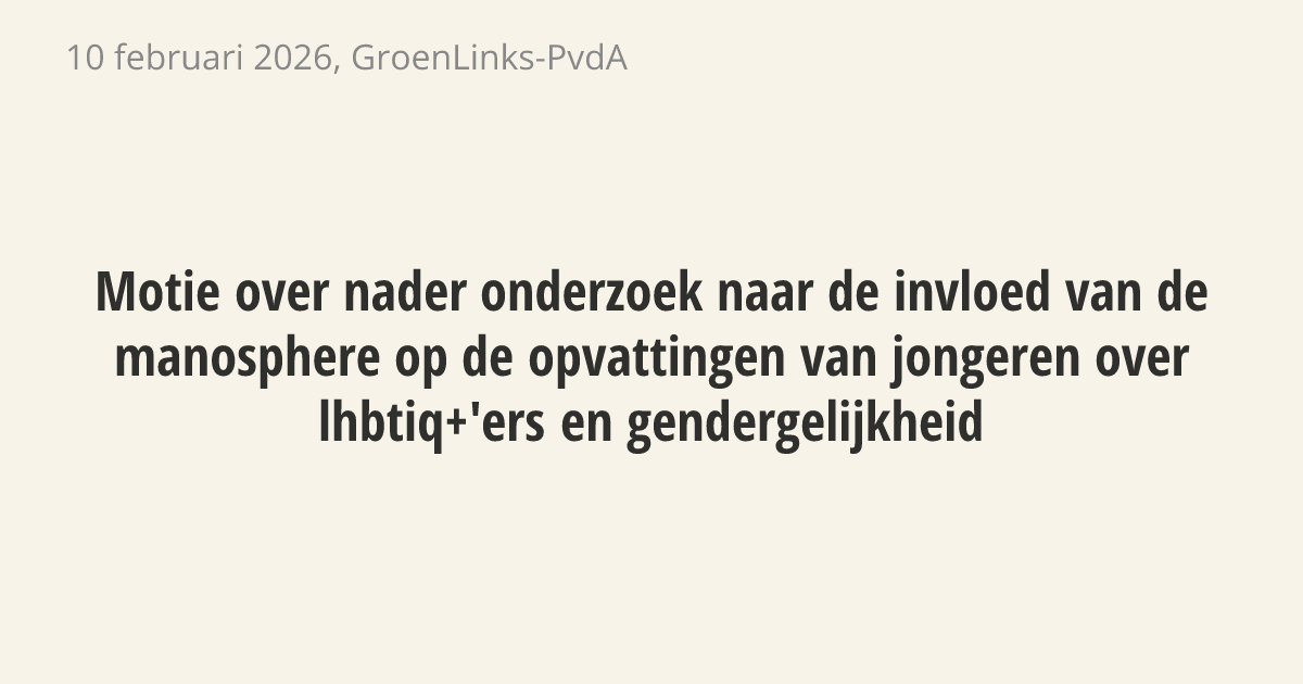 De regering moet laten onderzoeken hoe de 'manosphere' de mening van jongeren over vrouwen en lhbtiq+'ers beïnvloedt. De manosphere is een online omgeving waar vaak haat tegen deze groepen wordt verspreid. Sociale media versterken nu schadelijke vooroordelen, terwijl de precieze invloed van deze online groepen op jongeren nog niet eerder is onderzocht.