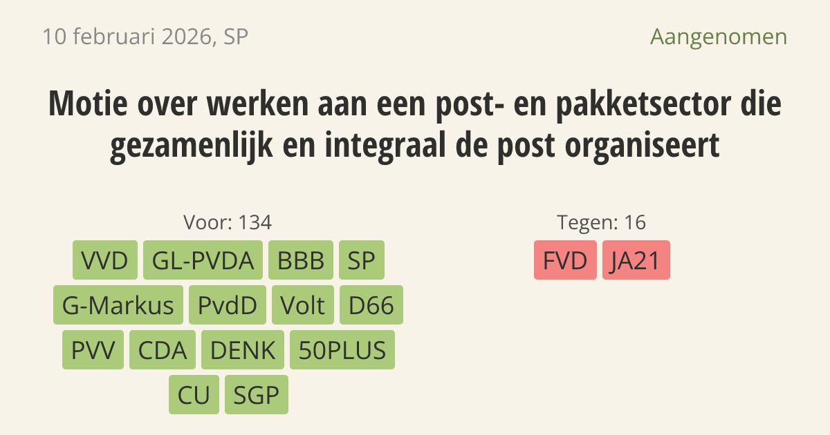 De regering moet ervoor zorgen dat post en pakketten meer samen worden bezorgd. Nu rijden er te veel verschillende busjes door de straat, terwijl de gewone post minder vaak komt. Een gezamenlijke aanpak vermindert de drukte in het verkeer en de hoge werkdruk voor bezorgers. Ook blijft de bezorging zo voor iedereen bereikbaar.