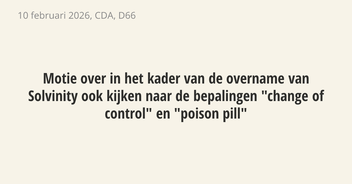 Motie van de leden Zwinkels en El Boujdaini over in het kader van de overname van Solvinity ook kijken naar de bepalingen "change of control" en "poison pill"