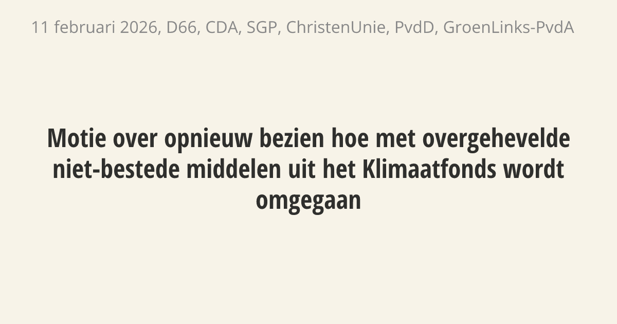 De regering moet opnieuw bekijken wat er gebeurt met geld uit het Klimaatfonds dat is overgemaakt naar andere ministeries maar niet is opgemaakt. Nu botst de wet met de begrotingsregels. Het is belangrijk dat dit geld behouden blijft voor het Klimaatfonds, omdat het speciaal is gereserveerd voor klimaat- en energieprojecten waarvan de startdatum nog onzeker is.