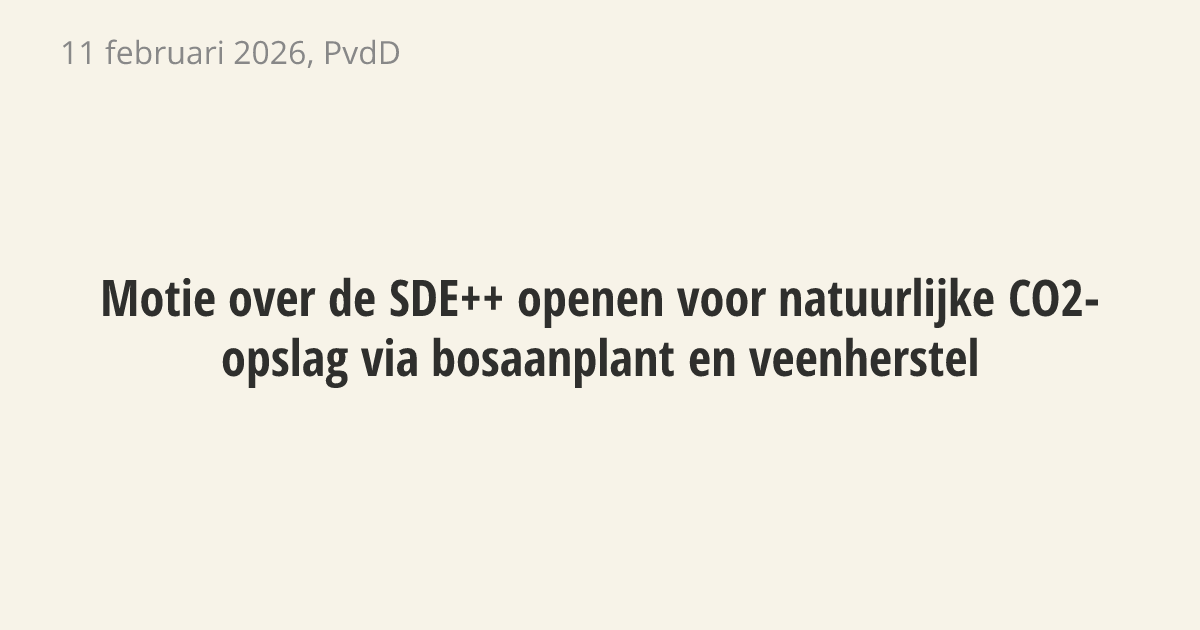 De regering moet de regeling SDE++ openstellen voor natuurlijke CO2-opslag. Dit betekent dat er vanaf 2027 subsidie komt voor het planten van bos en het herstellen van veengebieden. Het opslaan van CO2 via de natuur is veel goedkoper dan de technologische oplossingen die nu subsidie ontvangen. Ook zijn de huidige doelen voor de aanleg van nieuw bos nog lang niet gehaald.